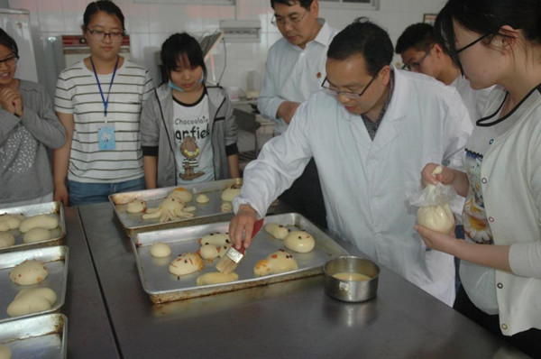 DIY制作期间,选手们都按照老师要求的力度用心揉面,尽管面团水分过多不能快速成型,选手们仍不气馁,小心翼翼地用指尖捏造着,唯恐力度不够造型不到位。经过两个小时的发酵和十分钟的高温烤制,香酥柔软的面包出炉了。看着倾注一下午心血的面团变成了诱人的舌尖上的美食,参赛选手兴奋得开始给每个面包取起名字来“这个叫小黄鸭,那个叫拼命乌龟”,各式各样的爱称层出不穷。党委书记李树安打趣道:“这一个个面包就如刚出土的珍贵文物,出炉后人们总能挖尽心思地赋予他新的名称和意义,这也寄予了同学们对劳动成果的珍惜之情呀!”