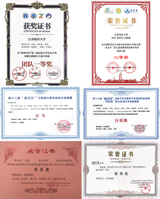 水产养殖学专业众多学生积极投身学术研究,成果频出。近年来,学生主持大学生创新创业训练计划项目多项,参与导师国家级、省部级、市厅级及横向课题多项,发表论文和授权专利多件。在学科竞赛中多名学生获奖,如第七届中国国际“互联网+”大学生创新创业大赛金奖-“黄金财鳢-黑鱼产业转型升级的领跑者”、第十二届“挑战杯”江苏省大学生创业计划竞赛银奖-《知鱼之乐—遇见未来水族》、第一届全国大学生水产技能大赛特等奖、全国大学生水族箱造景技能大赛特等奖、高校大学生水产类创新实践能力大赛团队一等奖等。